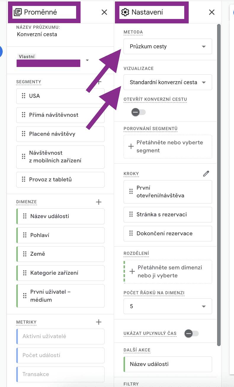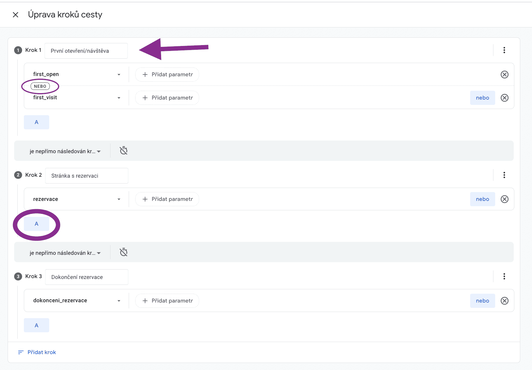 Pak jdete do složky „Kroky“ a nastavte jednotlivé kroky pro svoji konverzní cestu. Pro přehlednost jsem nastavila jednoduchou konverzní cestu, která se skládá z několika kroků: návštěvnost webu, otevření stránky s možností rezervace, dokončení rezervace. Při výběru jednotlivých kroků můžete pracovat s operátory a/nebo a nastavit podmínky kroku dle svých potřeb. Zároveň každý krok se dá pojmenovat;