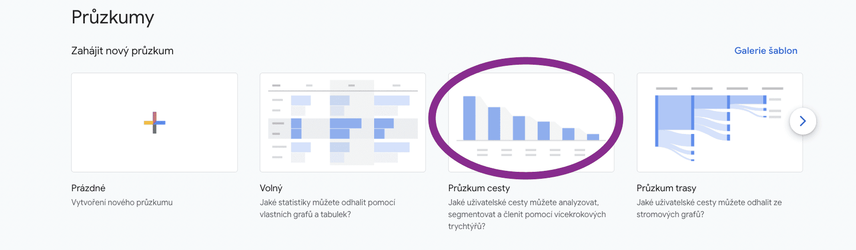 Ihned před sebou budete mít několik šablon průzkumu, které GA4 defaultně nabízí;