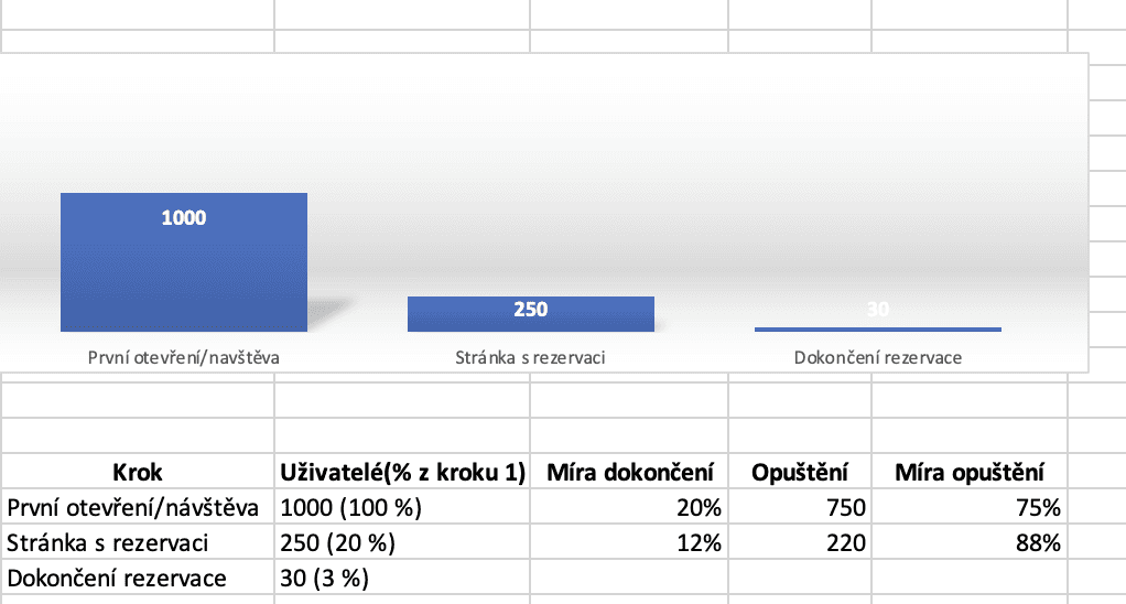 První atribut (sloupec) vyjadřuje, kolik procent uživatelů z předchozího kroku uskutečnilo daný krok. V mém případě data kroku č. 2 „Stránka s rezervaci“ říkají, že 250 uživatelů z kroku č.1 „První otevření/návštěva“, nebo 20,0 % z těch, kdo navštívil web, otevřelo stránku s rezervací, a 30 lidí, nebo 3 % z těch, kdo navštívil web (krok č. 1), dokončilo rezervaci. Tzn., že ve sloupci „Uživatelé (% z kroku 1)“, procentuální vyjádření se počítá ve vztahu ke kroku č. 1.